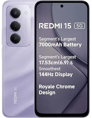 Redmi 15 5G Sandy Purple 8GB + 256GB | Segment’s Largest 7000mAhA Battery | Segment’s Largest Display 17.53cm(6.9) Up to 144Hz | Snapdragon 6s Gen 3 | 18W Reverse Charging | 50MP AI Dual Camera